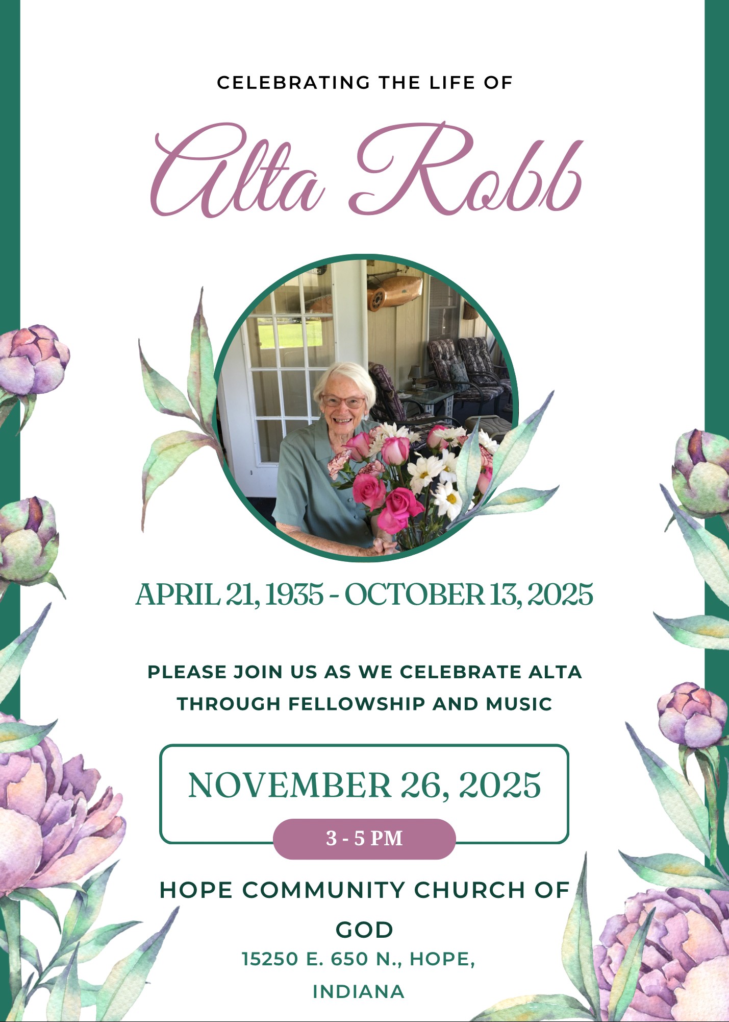 Alta's Celebration of Life will be from 3 to 5 p.m. Wednesday, November 26 at Hope Community Church of God, located at 15250 E. 650 N.