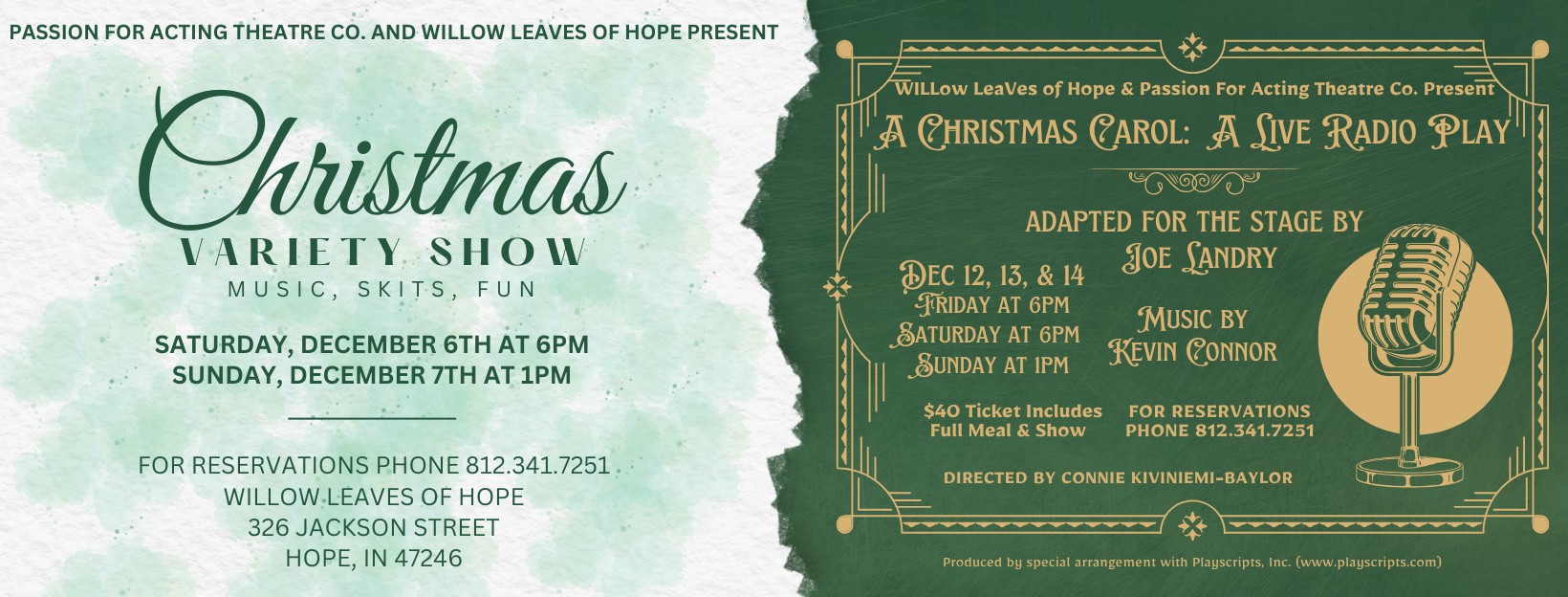 Don’t miss a two-show offering of the Christmas Variety Show filled with festive fun, music and skits and “A Christmas Carol: A Live Radio Play” the following weekend. Both productions are made possible by the Passion for Acting Theatre Co. in collaboration with WILLow LeaVes of Hope.