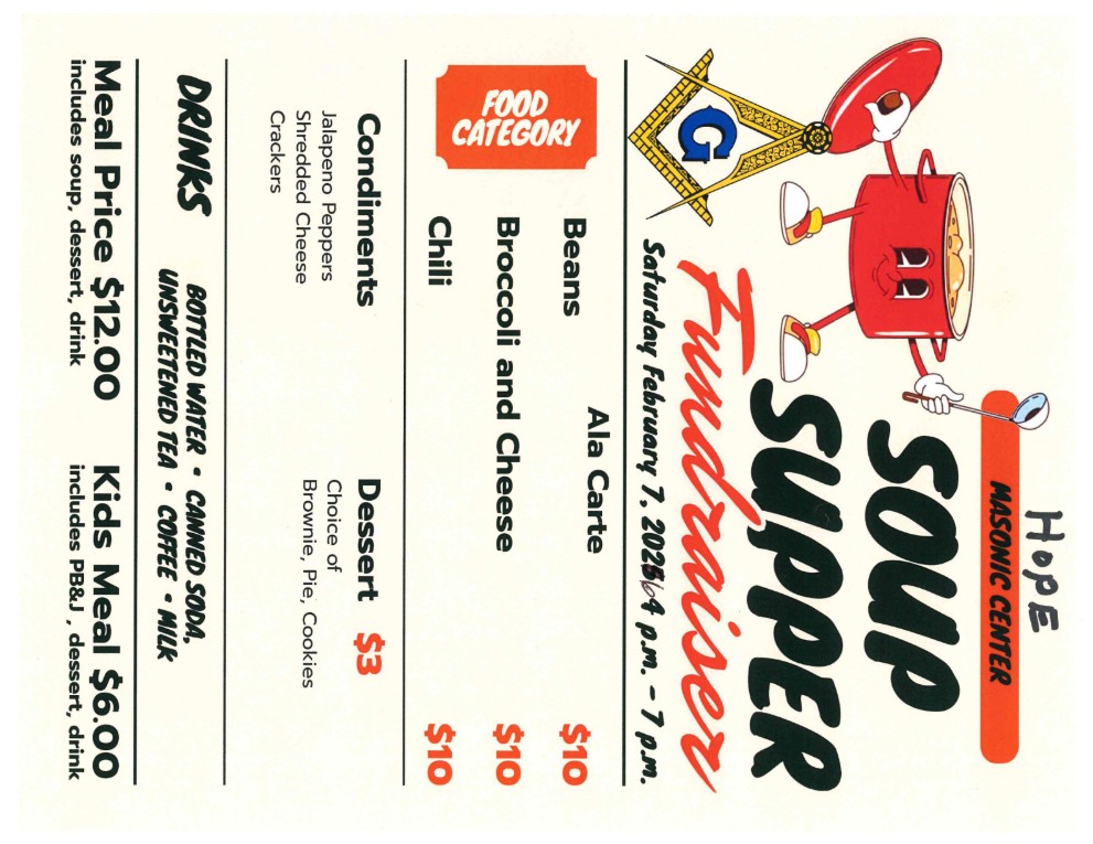 Hope Masonic Center Hosting Soup Supper Fundraiser 02/07
